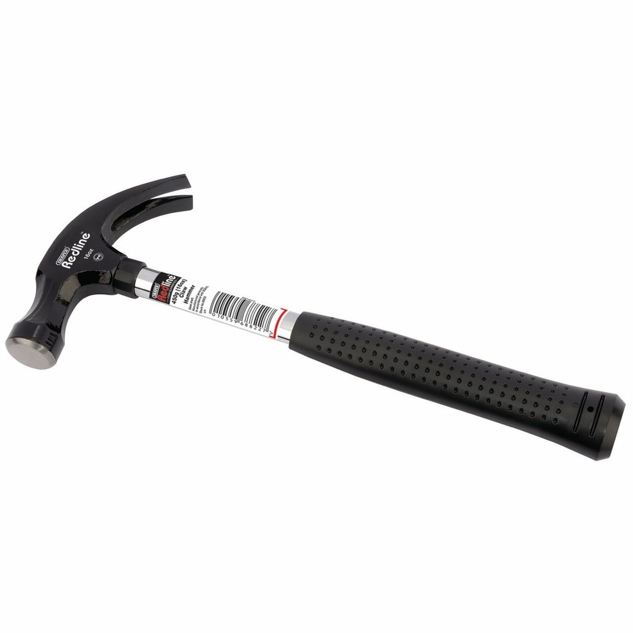 Draper Redline Claw Hammer, 450g/16oz - Fine grain carbon steel, black painted head, hardened and tempered with a polished striking face. Hardened tubular steel shaft with rubber grip. Multiples of 12 only, Supplied in countertop display.