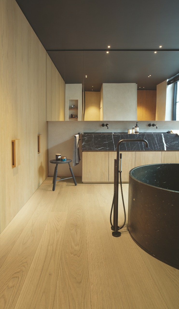 Quickstep Amato Leather Oak Engineered Flooring offers a distinctive and sophisticated aesthetic with its unique leather-toned oak finish. The surface is expertly brushed to enhance the natural wood grain, providing a textured and tactile quality that adds depth and character. The extra matt lacquered finish not only protects the wood but also gives it a refined, low-sheen look, enhancing the richness of the leather-like colour while minimising reflections and fingerprints.