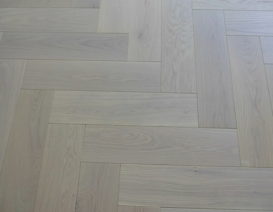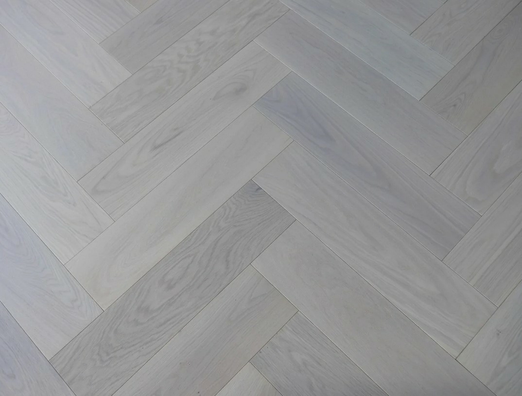 Tradition Engineered Oak Parquet Flooring, Herringbone, White Oiled, 90x14x450mm is a high-quality flooring in the prime grade.