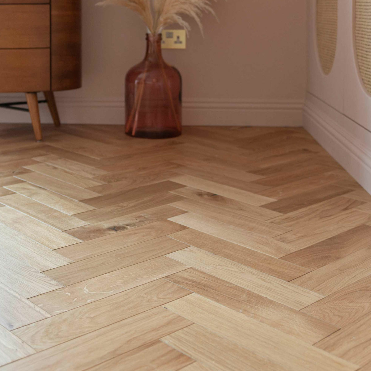 V4 Deco Parquet, Natural Oak Engineered Flooring, Rustic, Smooth Sanded & Hardwax Oiled, 90x14x400mm wear layer is smoothly sanded and simply finished in durable hard wax oil enhancing the beauty of the natural grain.