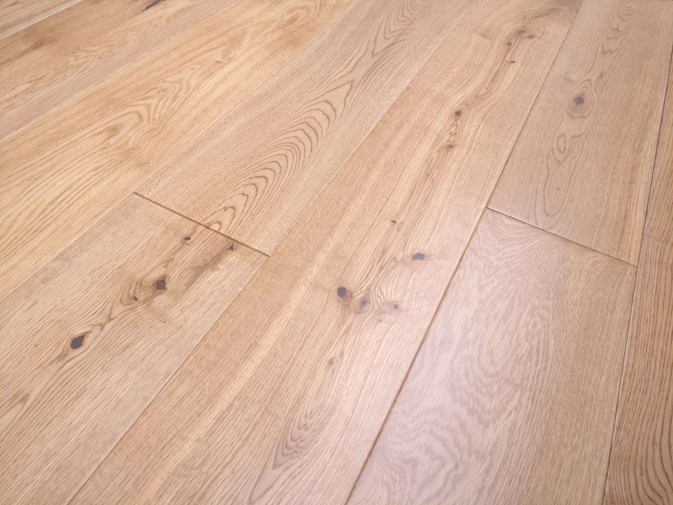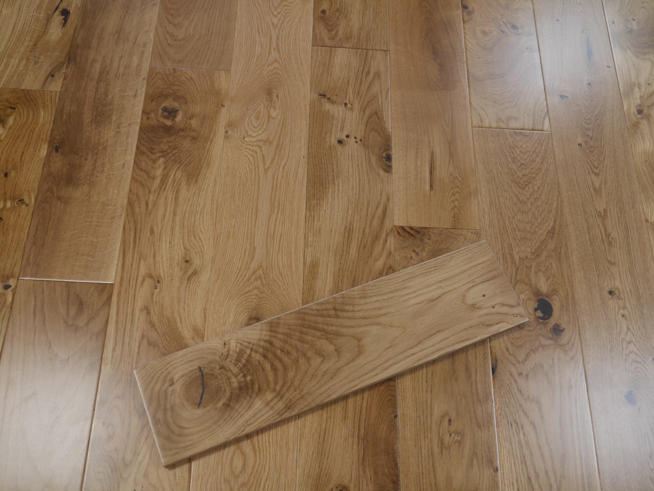 The floor is prefinished with a durable factory-applied satin lacquer, it is easy to clean and provides a sheen that gently reflects the lights. The UV Varnish finish provides a darker golden brown effect to the oak planks.